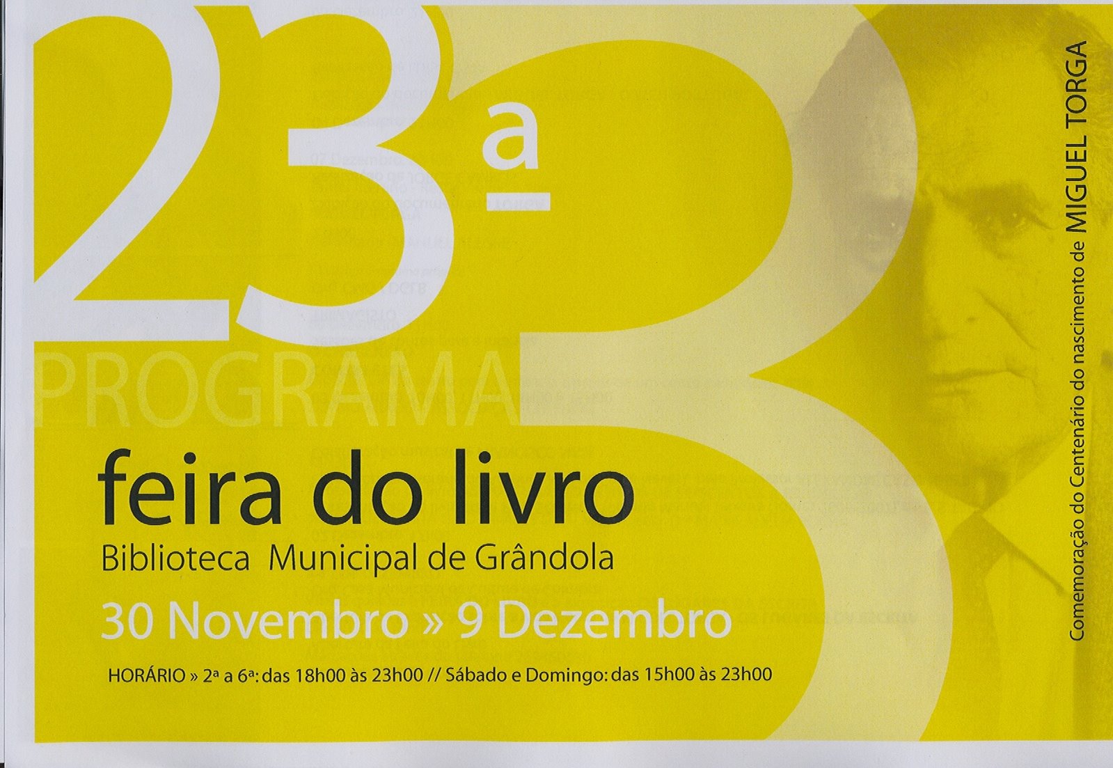 Embora a imagem scanada do programa vá aparecer um pouco mais adiante nesta crónica, não hesito em destacar a abertura da Feira hoje às 21h, uma visita à Exposição sobre o Miguel Torga que nasceu há coisa de 100 anos, o Jantar Literário com base na sua bem temperada dieta mediterrânica.